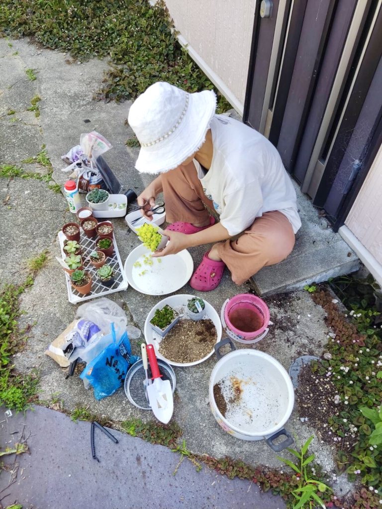 材料やら道具やらをあれこれ地べたに広げて多肉植物の植え替え。